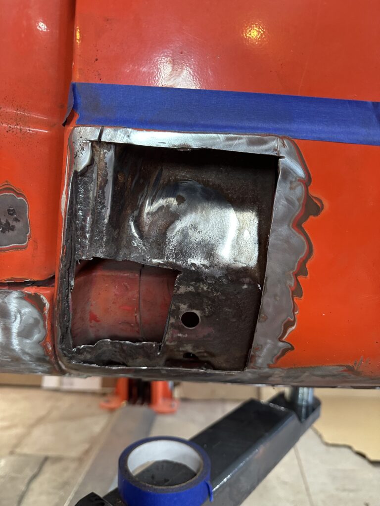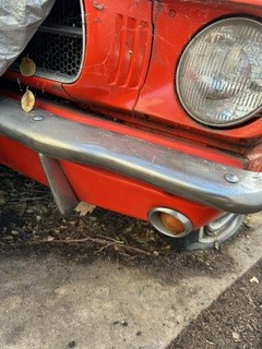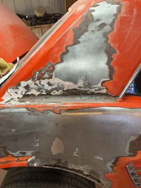 It has been some time since I have focused on the Mustang. I have removed most of the clip. Grille, lights, light holders, and a few more parts from the front end. I still need to remove the front bumper and the bottom of the front clip. I have not removed the front quarter panels yet. I have decided to try and complete the body work without having to remove the passenger side quarter panel. Today, I cut out the rust on the passenger side quarter panel. The right quarter panel appears to be fine. So far, all that needs to be completed on the driver side quarter panel is a good sanding, a skim of body filler, primer, and paint. Below is the start of the passenger side rust repair. I had cut out what I thought was enough rusted material. I made my metal patch panel. when I started grinding down the quarter panel edges for welding, I noticed that there was more weak (rusted) metal. I then cut out the rest of the rusted area. Next, I will create a new patch for the quarter panel. One for the inside brace and one for the outer patch panel. Below are the quarter panel cutouts. I am hoping to have the metal work completed and welding in sometime tomorrow.